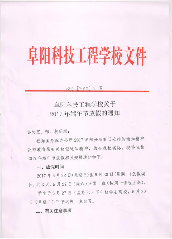 阜阳科技工程学校关于2017年五一国际劳动节放假的通知