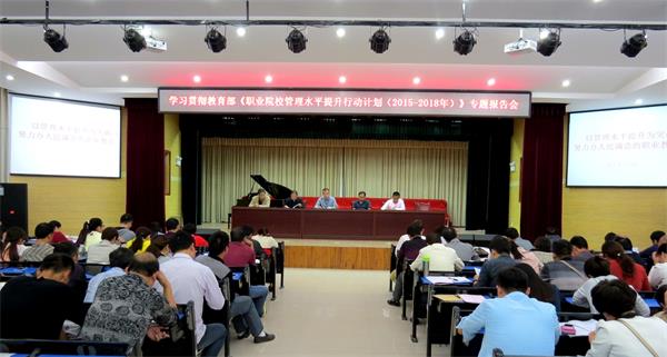 10月19日下午,学习贯彻教育部《职业院校管理水平提升行动计划(2015-2018年)》专题报告会在我校实训楼多功能报告厅举行。