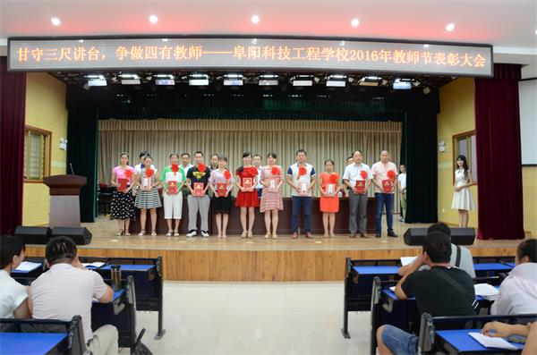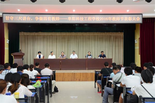 9月9日下午,阜阳科技工程学校2016年教师节表彰大会在校实训楼五楼报告厅隆重举行。全体教职工参加了会议。