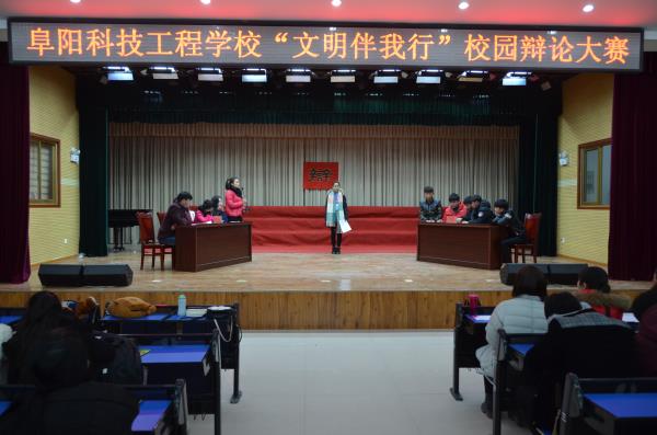 为了提高学生的思辩能力,丰富课余生活,培养团队精神,锻炼思维表达能力,养成良好的校园文明行为规范,促进校园文明建设。12月17日晚,阜阳科技工程学校首届“文明伴我行”校园辩论大赛在学校多功能报告厅举行。
