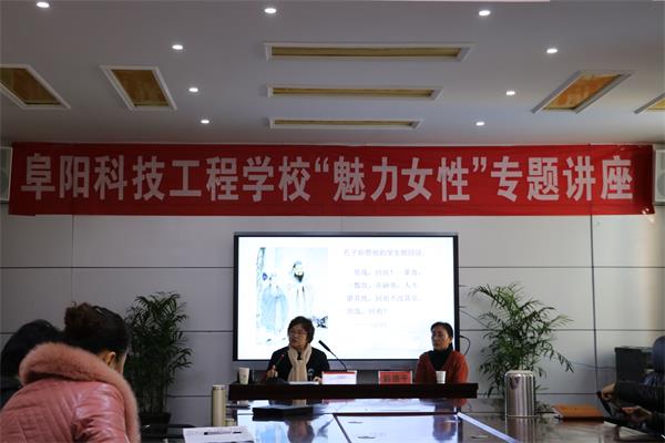 3月18日,一场以“国学视野中的女性修养----魅力女性”为主题的讲座在阜阳科技工程学校举行,学校女子雅修学院全体学员参与聆听。