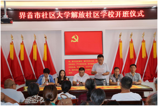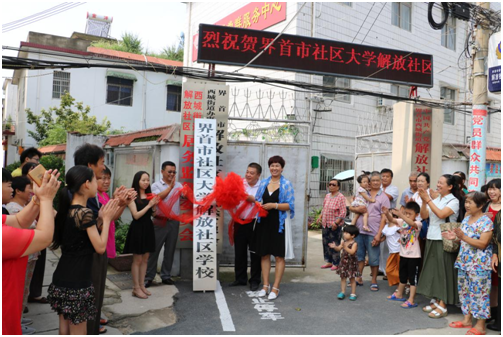 为加快推进界首市创建国家级职业与成人示范市建设步伐,2017年8月20日上午,界首市社区大学解放社区学校举行了揭牌仪式和首期培训班开班仪式。界首市教育局、阜阳科技工程学校、西城街道办事处及解放社区负责人参加了开班仪式庆典活动。仪式由解放社区书记闫玲玲主持,界首市教育局职成科科长邹盼盼、阜阳科技工程学校校长于洪波等对界首市社区大学解放社区学校挂牌成立发表了祝贺致辞。