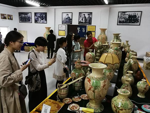 参与调研的老师先后走进界首市古窑址、界首市伟盛古陶瓷公司、界首市卢丽华彩陶公司等地方,听取了企业负责人对界首彩陶历史、发展现状及公司人才需求等方面的介绍,实地观看了界首彩陶生产车间,详细了解了界首彩陶制作流程和烧制技艺,与传承人共同探讨了界首彩陶的现状及发展方向。