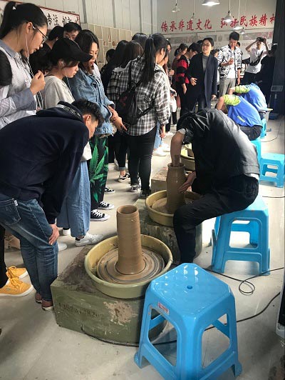 阜阳师范学院师生一行实地参观了彩陶实训室,详细了解现代学徒制教学开展情况,并在小师傅们的指导下体验拉坯过程。