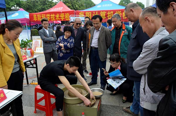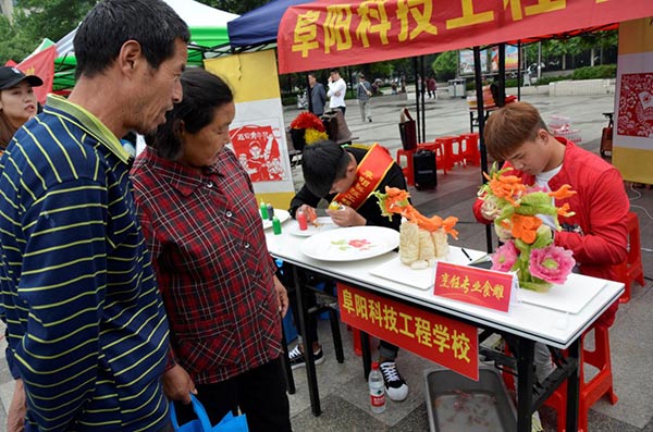 活动现场,阜阳科技工程学校以“技艺展示、互动体验”的理念设计展区,选择了“界首彩陶、剪纸、食雕、茶艺、美容保健”等专业技能进行表演互动,吸引了众多群众和电台、报社的记者围观体验,增进了人民群众对职业教育的了解,取得了良好的宣传效果。
