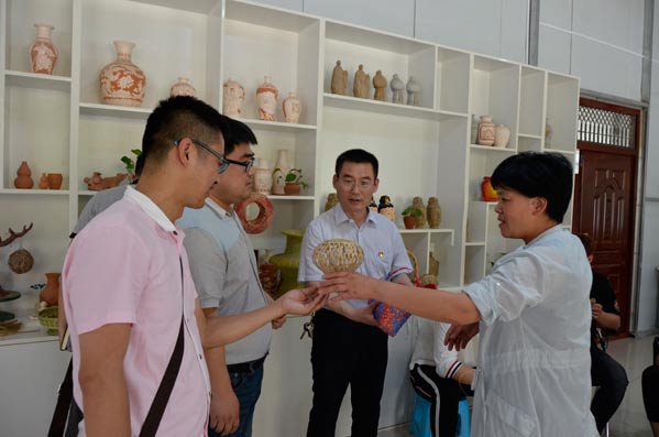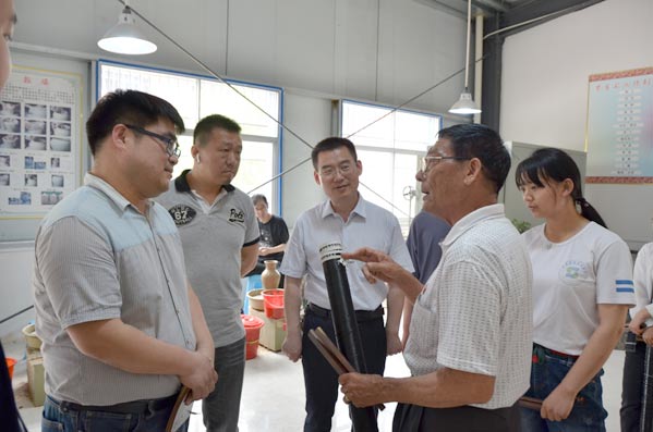 采访中,梁志就学校非遗教育工作和传承人才培养情况进行了讲解。俞路石等人实地察看了学校界首彩陶专业实训基地和渔鼓、竹编、剪纸等非遗社团活动室,同时饶有兴趣的观看了拉坯工艺、渔鼓表演和学生剪纸、竹编作品,对师生高超的技艺给予高度评价,充分肯定了阜阳科技工程学校在非遗教育传承方面取得成效。