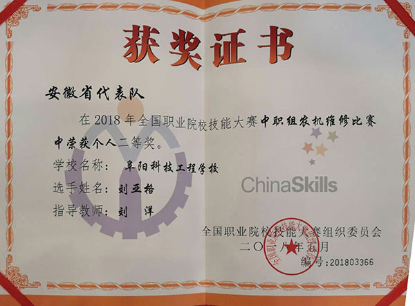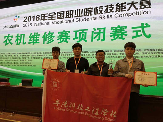 安徽省农机维修赛项代表队在领队于洪波的带领下,经过两天的激烈角逐,阜阳科技工程学校刘洋老师辅导的两名选手杨思奥、刘亚格双双摘取银牌,实现了阜阳市在该赛项的历史性突破,为安徽省代表队赢得了骄人的荣誉。