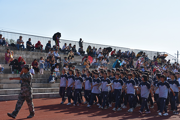 总指挥一声令下,会操表演正式开始。2018级新生21个连队依次上场,集合、报数、四面转体、齐步走,每个班级依次展示了训练项目,孩子们与教官配合默契,彰显了和谐团结争一流的集体主义精神,赢得了家长们的热烈掌声。虽然训练时间只有八天,但是成果却颇为丰硕。同学们个个抬头挺胸、英姿飒爽,饱满的精神、整齐划一的队伍、响亮的口号展现出阜阳科技工程学校学子蓬勃向上的精神风貌。