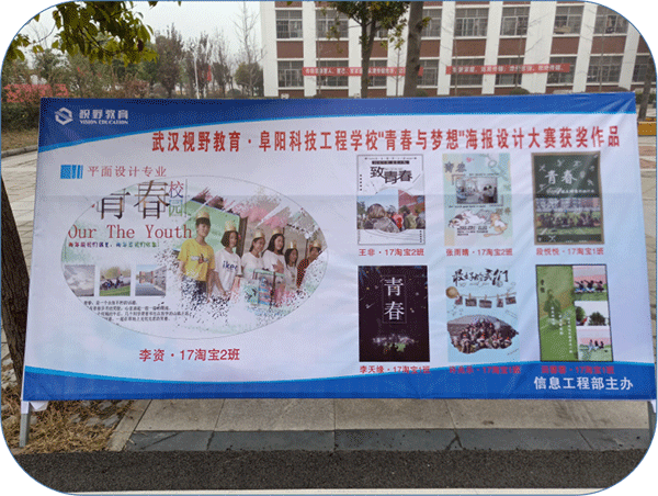 1130,阜阳科技工程学校举行了“武汉视野阜阳科技工程学校‘青春与梦想’海报设计”颁奖典礼。阜阳科技工程学校教务处主任张军、武汉视野教育咨询有限公司胡文华、阜阳科技工程学校信息工程部负责人李明光及电商专业全体学生参加了典礼。