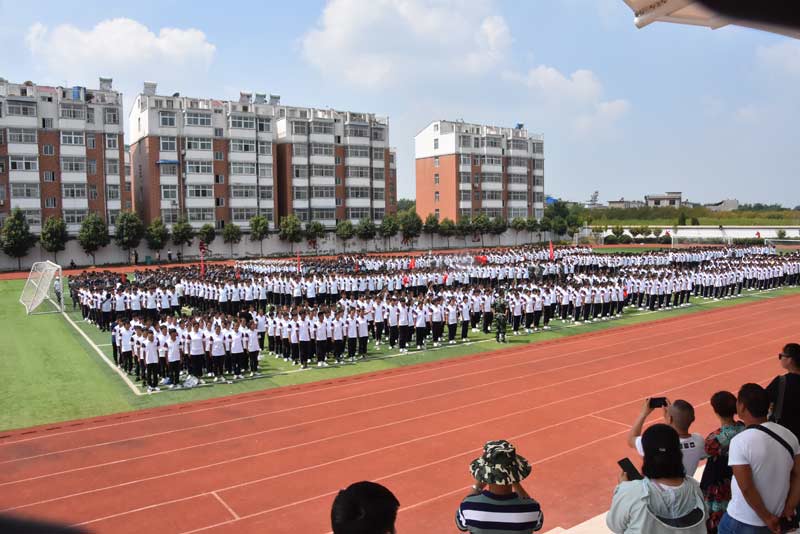 1800多名学生整齐列队,精神抖擞,口号嘹亮,展示了稍息与立正、跨立于立定、四面转法、齐步走、正步走、跑步走以及敬礼与礼毕等基本军事科目。