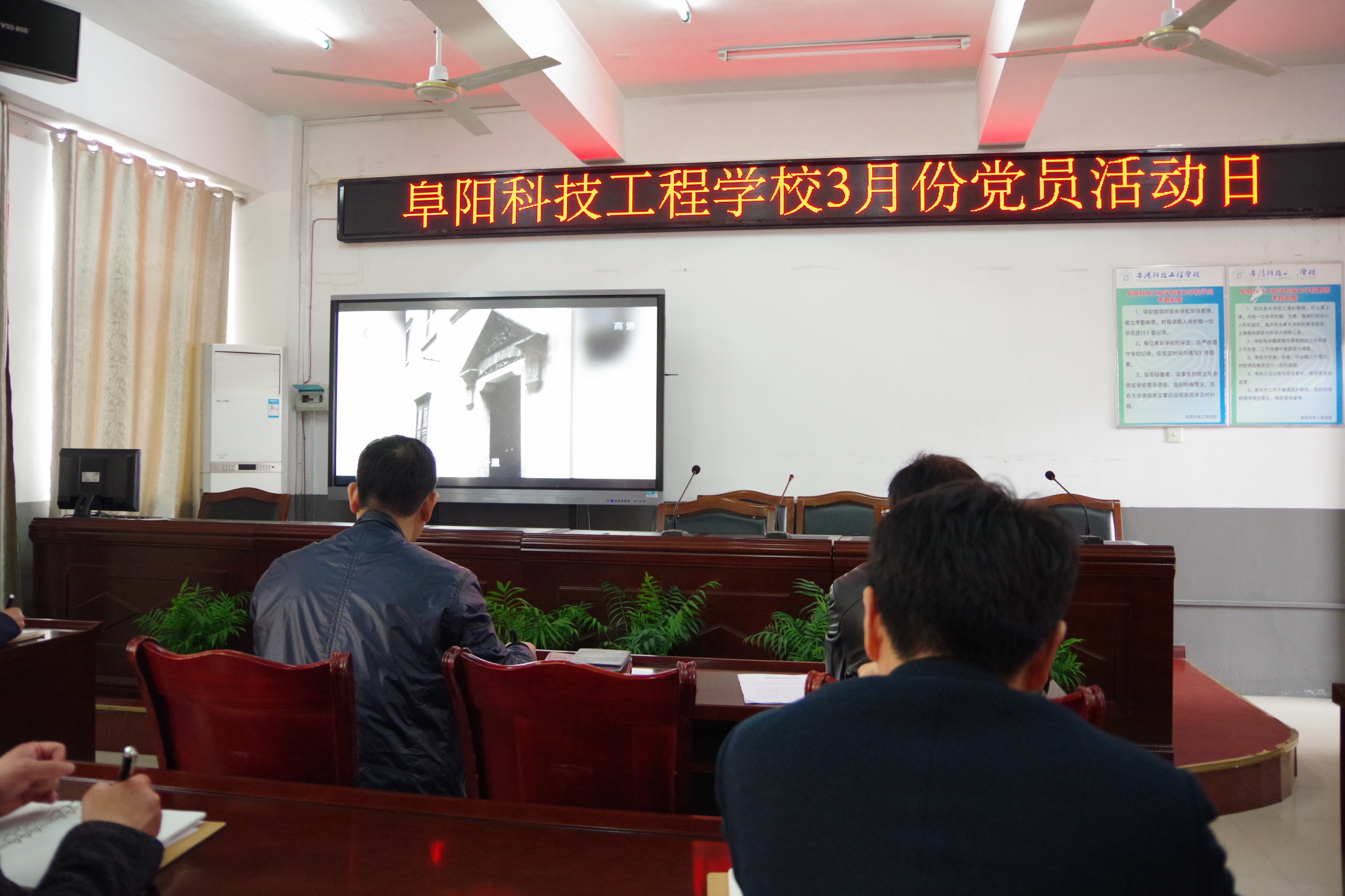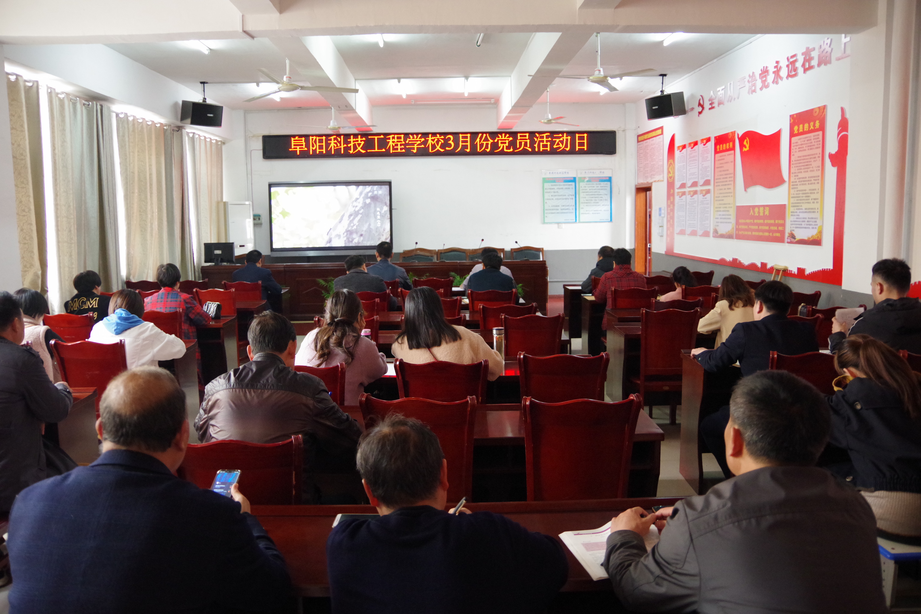 为弘扬爱党、爱国情怀,了解中国共产党建党时的艰辛。329日下午阜阳科技工程学校在笃行楼四楼东会议室举行3月份党员活动日,观看了党史纪录片《红之里》。